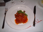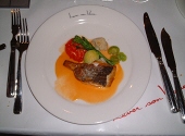 鮮スズキのポアレ、クルスタセの軽いソース春野菜添え